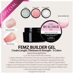 Femz Builder Gel is a product that is thick in viscosity and is perfectly formulated for extensions, overlays and building shape. Designed specially to sculpt beautiful shapes and create length to your nails up to 1cm. If you're looking for a product to create length or add thickness and strength to your natural nails, then Femz Builder Gel is the perfect product. Stronger than regular gel polish and durable as Acrylics, it provides the perfect balance. You can apply builder gel to either natural nails for a non-chip overlay, or use it to create extensions or enhancements for a long lasting 14+ day manicure. Note: When applied on natural nails, a strong and healthy base is required. This product Is ideal for nails that are weak, brittle and prone to splitting because of the thicker viscosity than regular Gel Polish. This product provides better protection and strength to nails that are fragile. 3 Colors to choose from.
